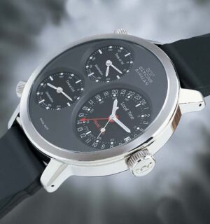 Cassa in acciaio del diametro di 53 millimetri impermeabile fino a 5 atmosfere. Tre movimenti automatici, a vista, con indicazioni dell’ora di 4 zone diverse: al 3 per l’ora locale, data e ore del mondo, con sfera a freccia rossa, al 10 e all’8 per gli altri due fusi. Corone collocate al 3, all’8 e al 10 per la correzione delle funzioni. Quadrante antracite con contatori neri, sfere e indici lumin