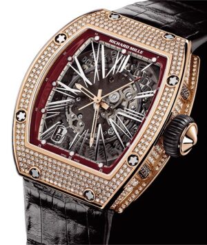 Orologio animato dal calibro automatico RM 005-S scheletrato, a vista, con rotore di geometria variabile in titanio. Platina e ponti in titanio, doppio bariletto, viti in titanio, riserva di carica di 55 ore. Quadrante e fondello in zaffiro con trattamento antiriflesso sui due lati, cifre romane applicate in maniera asimmetrica, indicazioni di ore, minuti e secondi al centro, datario semi-istantaneo con finestrella al 7. Cassa in oro rosa completamente incastonata da diamanti, corona in oro rosa con collare in Alcryn. Cinturino in coccodrillo con chiusura double déplyante. Disponibile anche senza diamanti e in titanio