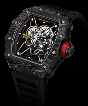 Orologio animato dal calibro RMUL3 scheletrato a carica manuale. Platina in titanio, ponti in titanio trattati Titalyt. Cassa di 49,94×42,00 millimetri in NTPT® carbonio, impermeabile fino a 5 atmosfere, assemblata con 20 viti in titanio e 5 rondelle in acciaio. Corona in NTPT® carbonio con O ring in Alcryn rosso. Quadrante in zaffiro, lancette luminescenti, sfera dei secondi con punta rossa. Cinturino in gomma