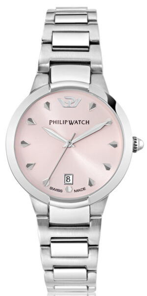 Solo tempo da donna con cassa di 34 mm e bracciale in acciaio lucido e satinato con fibbia déployante. Quadrante…