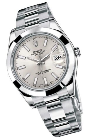 Orologio con cassa in acciaio di 41 millimetri, impermeabile 100 metri. Lunetta liscia. Quadrante argentato finitura soleil, indici e lancette…