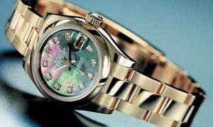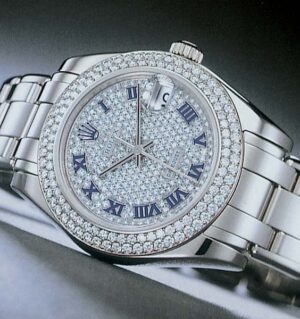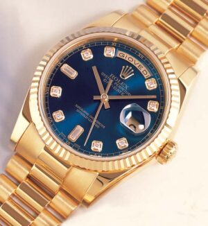 Cassa in oro giallo, impermeabile 10 atmosfere. Quadrante blu con 8 indici in brillanti e 2 baguette, finestra per il…