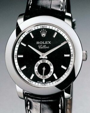 Cassa in platino di forma tonda di 38 millimetri. Quadrante nero, indici a barretta applicati, contatore dei secondi al 6.