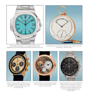 Due sessioni d’asta – 11 e 12 dicembre – ad altissima tensione anche per Phillips, che ha concluso il 2021 con un record straordinario – il 100% di venduto in ciascuna asta – e con un totale annuo di 209,3 milioni di dollari! Tra gli orologi, protagonista indiscusso della vendita di New York – che da sola ha totalizzato 35,9 milioni di dollari – è stato l’ormai famoso Patek Philippe Nautilus Ref. 5711 con quadrante Tiffany Blue®, con la sua aggiudicazione straordinaria di 6.503.500 dollari interamente devoluta a The Nature Conservancy. Dalla stessa vendita, grande evidenza per uno spettacolare orologio da tasca con tourbillon di George Daniels realizzato nel 1971 per Edward Hornby e accompagnato da una lettera scritta a mano del maestro George Daniels, aggiudicato per 1.663.500 dollari; per un Rolex Chronograph Daytona Ref. 6241 in oro a 14 carati con quadrante champagne Paul Newman del 1968 circa, venduto per 756.000 dollari; per un F.P. Journe Remontoir d’Egalité avec Seconde Morte con cassa in oro rosa e quadrante in madreperla del 2005, venduto per 718.200 dollari; per un Omega Speedmaster in acciaio appartenuto a Ralph W. Ellison, datato 1968, nuovo record del mondo per la referenza 145.012-67 con una incredibile aggiudicazione di 667.800 dollari; per un Audemars Piguet Royal Oak in oro rosa Tourbillon squelette del 2010, la cui aggiudicazione di 630.000 dollari è stata devoluta alla Fondazione The One Drop.